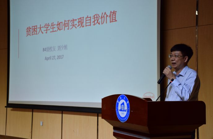 接下来,84级化学专业校友刘少旭分享。他目前任德国汉高公司全国销售经理,连续多年销售业绩排名于行业前列。他从贫困大学生如何实现自我价值入题,深刻分析了当代贫困大学生的未来之路,给出了许多宝贵的意见和建议,为同学们未来的发展指明了方向。