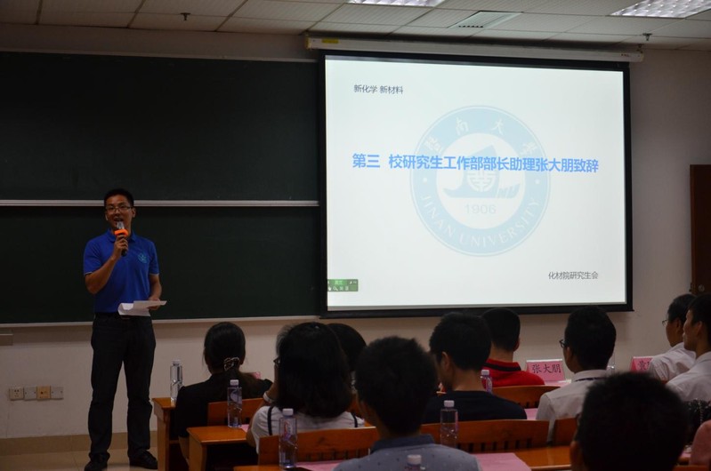 校党委研究生工作部张大朋老师首先致辞。他对各位支持研会工作的老师表示感谢,对于研会未来发展,他建议要坚持民主集中制,要求研会所有成员必须全力以赴,全心全意为同学服务。