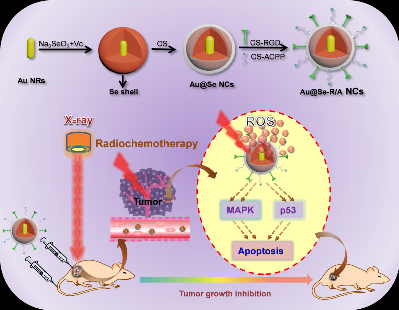 目前,放疗和化疗是临床上肿瘤最常用的治疗方法,但其疗效受到射线辐射剂量和药物毒性的极大限制。因此,开发高效低毒的放化疗增敏剂具有重大意义。近年来,大量的无机金属纳米粒子被应用于放疗增敏。其中,金纳米粒子(AuNPs)因其独特的光学性质、良好的组织相容性、易控的表面修饰性等使其在生物及医学领域有了广阔应用前景。硒是人体必需的重要微量元素,以硒为原料来设计纳米体系,既能发挥硒的生物学功能,同时又兼具纳米载体的载药与协同功能。陈填烽课题组在前期工作中,以多种蛋白、多糖、多肽及小分子作为修饰剂,合成了多个系列不同形貌的纳米硒(SeNPs),并用其为载体来负载临床用的抗肿瘤药物,发现可实现良好的协同化疗增敏的效果。在此基础上,该团队通过整合Au NRs的放射增敏特性和SeNPs的抗肿瘤活性,设计合成了核壳结构的Au@Se纳米复合体系(NCs),并进行双靶向分子表面修饰,实现肿瘤靶向的同步放化疗法。该纳米复合体系表现出优越的肿瘤靶向能力、良好的生物安全性、高效的放射增敏作用和显著的体内抗肿瘤效果。进一步的机理研究表明,NCs和X-ray联合应用是通过死亡受体途径诱导肿瘤细胞凋亡并促进ROS过量产生从而激活下游ROS介导的信号通路,导致大大提高抗肿瘤活性。这项研究为肿瘤靶向的放化疗法提供了一种有效的临床可行的技术。