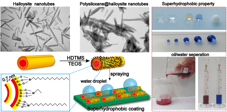 埃洛石纳米管的疏水化效果示意图和论文的主要实验结果图