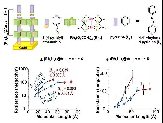 图1. Rh2-有机分子导线的组装和导电性分析
