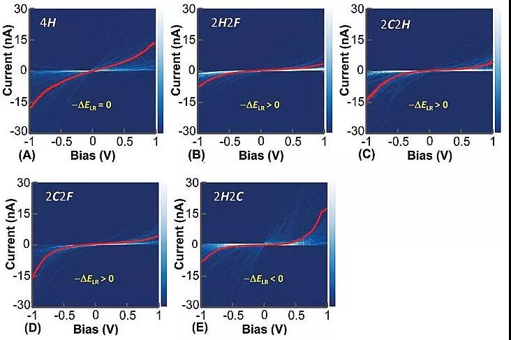 该课题组利用相同方法组装了一系列具有不对称结构的电子给体(D)-桥(B)-受体(A)偶极分子自组装层(SAM)。通过系统地改变分子的电子给体(D)和电子受体(A),发现分子内给-受体氧化还原不对称性(-ΔELR)的大小和正负决定了分子的整流比(RR)和整流方向。图3显示对称性分子4H,-ΔELR= 0,RR ≈0;当-ΔELR > 0,在负偏压下出现整流效应,且随-ΔELR增加RR增大;如果改变分子D/A连接顺序,则可改变其整流方向(对照图3C与3E)。因此,论文作者发现了一个新的、更易于组装和掌控的调控整流效应和方向的方法。这一成果近期发表在Chemical Communications 上。[2]
