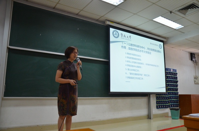 随后,邵桂珍对学院党委2018年上半年主要工作进行了简要回顾。她指出,过去的一年,学院党委深入开展学习贯彻党的十九大精神,以教学科研为中心,充分发挥政治核心作用,助推学院高水平大学建设;在党建方面,加强党支部组织力建设,推进学院党委和支部的换届工作,完善党员信息并梳理党员组织关系、并做好上级部门各层次党代会代表酝酿推荐工作;在学生思政及科技创新工作方面,注重文化引领,强化学生的管理;学院党委强化党风廉政建设主体责任,警钟长鸣,加强教育,完善相关制度,全力做好反腐倡廉工作;积极做好工会、统战、扶贫等工作。邵桂珍通报了新学期学院党委工作要点:加强党支部建设,完成学院党委换届工作,建立健全学院党委各项工作制度,继续推进校友工作。