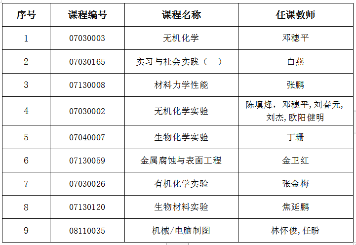 2018-2019学年第一学期,学校教务处组织全校学生进行了课程评估。德赢官网共开设有74门课程,其中《无机化学》(任课教师:邓穗平)等9门课程获评优秀,现将优秀课程名单予以公布: