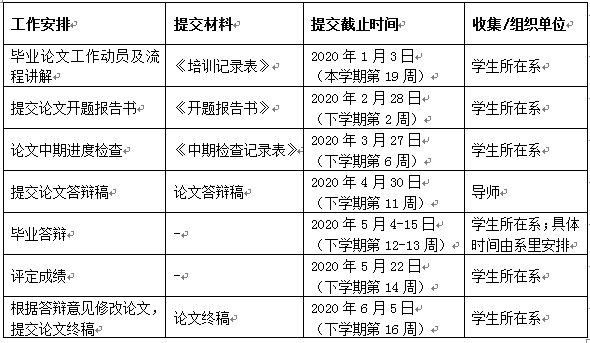 两系应在本学期第19周前完成毕业论文工作动员及流程讲解工作,在2019年1月3日前(19周周五)提交相应《德赢vwin体育官网登录本科毕业论文工作动员及流程讲解记录表》(附件12)。