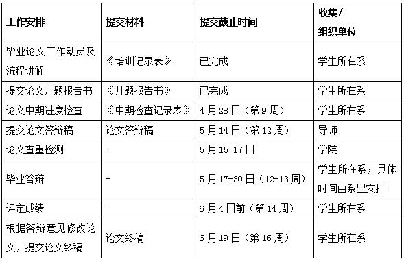 根据此前公布的毕业论文工作进度表(附件1),化学系、材料科学与工程系需做好在5月30日前完成学生毕业答辩的准备。