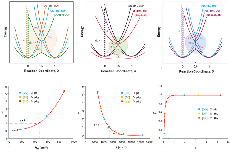 在该工作中,研究团队利用多重键合双钼单元[Mo2]作为电子给(Donor, D)、受(Acceptor, A)体,通过改变多联苯桥基(Bridge, B)配体的长度和替换配位原子(O/S),设计合成了三个系列、九个不同的混价D-B-A电子转移模型化合物。重要的是,这些化合物均表现出各自特征价电子迁移光谱(Intervalence Charge Transfer, IVCT),应用Hush-Marcus理论进行IVCT光谱分析能够获得电子转移反应重组能(l)、电子偶合矩阵元(Hab)、电子跳跃频率(nel)和速率常数(ket),对体系进行Landau-Zener分析。通过桥基和配位原子对电子和核运动时标的调控,实现了体系热电子转移从绝热限域,经过近绝热过渡区,到非绝热限域的转化。由此完整描述了绝热-非绝热电子转移热力学及动力学变化细节,第一次从实验上验证了Landau-Zener公式。研究发现,在近绝热限域体系发生非绝热跃迁的总概率(kel)约为0.5,这与理论上未合理化的应用值完全一致。计算表明,两个过渡态体系以单通道和第一多通道运作可达到总跃迁几率(kel~ 0.5)的95%。实验和计算结果显示,在ΔG* < 2Hab的强偶合体系,热电子转移γ = 5.26 (>>1), P0 = 1,kel =1, 由此证明Landau-Zener公式在绝热限域的适应范围不限于“窄反交叉区”(Narrow avoided crossing),比理论预期要宽得多。研究结果显示了当代电子转移理论在半经典框架下的完整性和系统性。