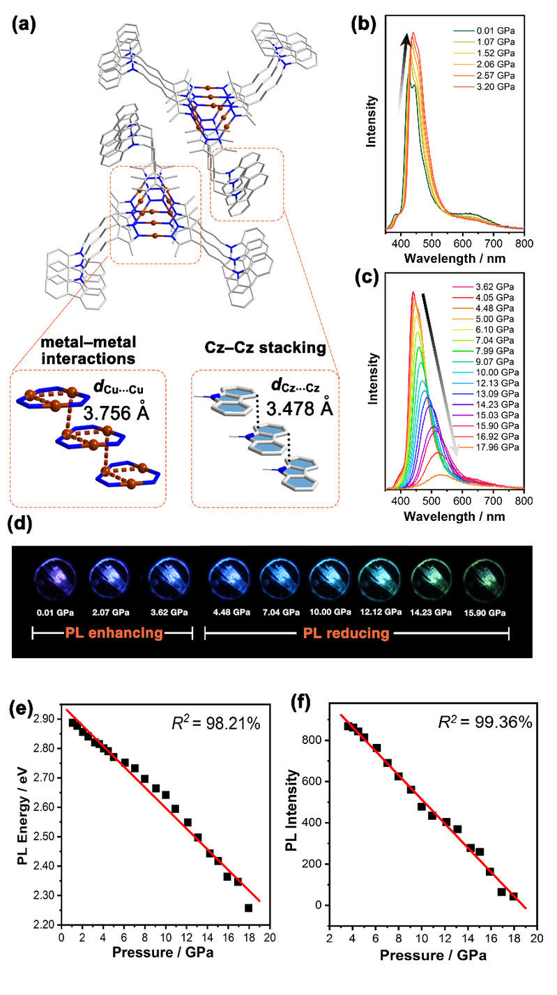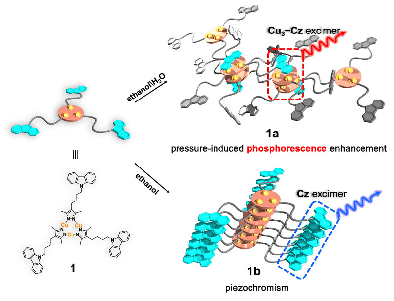 在此研究中,作者选择以柔性的丁基链,连接了两个经典的发光单元,吡唑环三核亚铜配位单元及有机发色团咔唑,合成了一种兼具柔性和刚性的金属配合物。通过调节反应溶剂,获得了不同的分子堆积形式(1a和1b)。其中,1a结构具有咔唑-环三核-环三核-咔唑的堆积形式,并具有较强的分子间铜-铜相互作用。在常温常压下,具有以咔唑的蓝光为主的双重发射。随着外压刺激,1a结构的红色磷光显著增强而荧光减弱,从而可以观察到明显的从蓝光到红光的发光颜色变化。压力持续增大时,红光逐渐减弱直至消失。在0 – 2.23 GPa 压力区间,低能红光的发光强度呈现指数级别增长;2.23 GPa以后,红光的发光强度与外压呈线性减弱关系。在0 – 2.23 GPa压力区间,1a结构的发光变化具有可逆性,在卸压后,仍能恢复咔唑的蓝光。结合理论计算研究,作者提出了相关变色机理:压力致使咔唑-环三核-环三核-咔唑堆积更紧密,有效增加了隙间窜越概率,从而造成荧光减弱磷光增强。