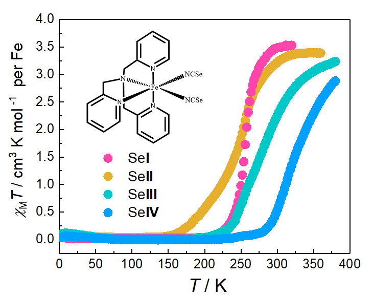 图2. [Fe(tpa)(NCSe)2]的四种同质异形体的变温磁化率曲线图。