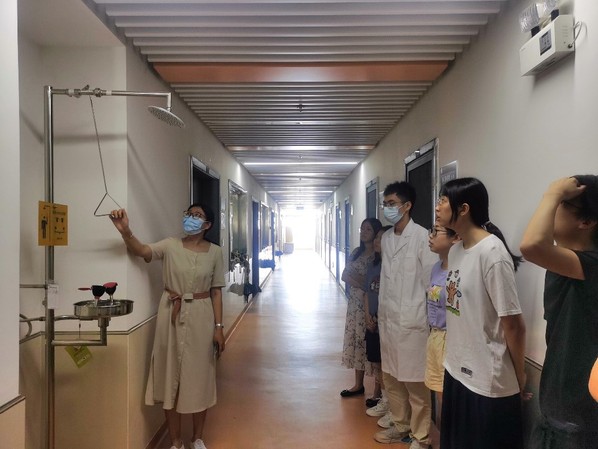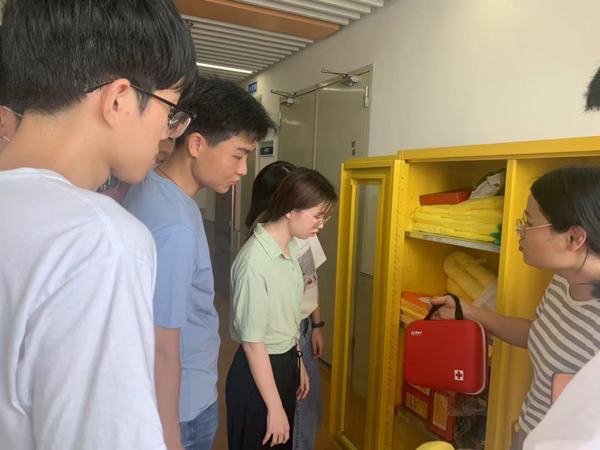 随后,实验中心组织实验技术人员到各实验室附近的安全应急柜、应急喷淋处,向学生介绍应急柜内物品名目及使用方法,并让学生实操应急喷淋与洗眼器的使用。