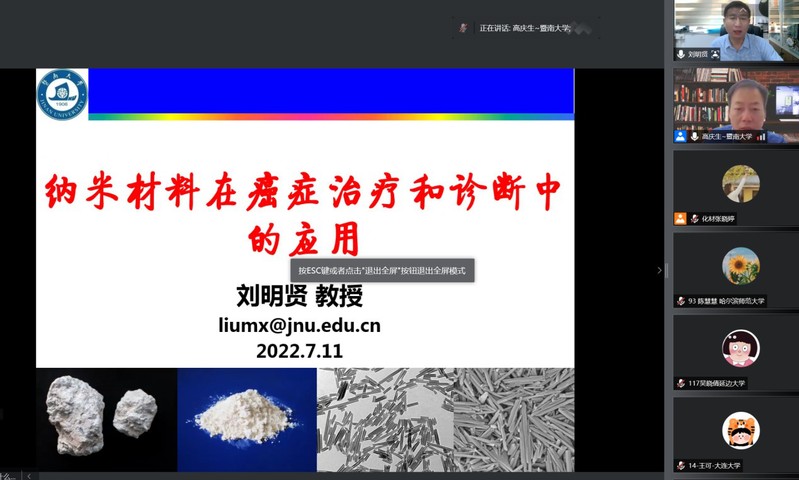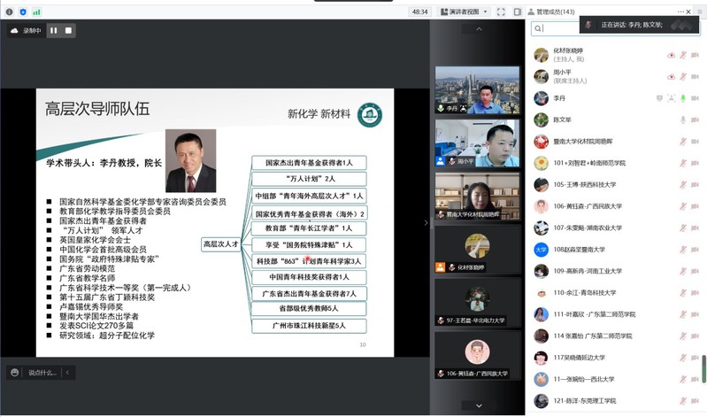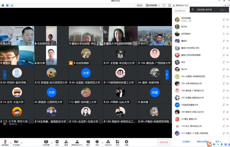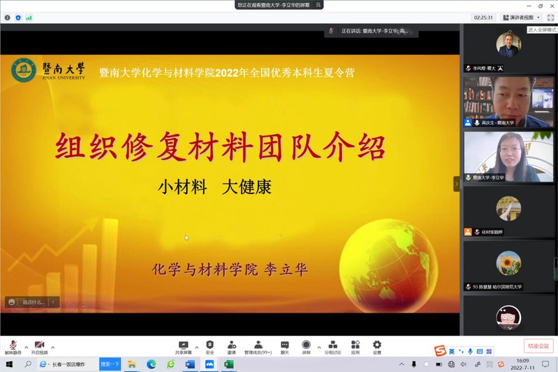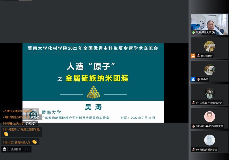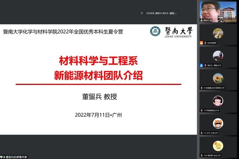 2022年7月11日至7月12日,德赢vwin体育官网登录全国优秀大学生夏令营在线上成功举办。本次夏令营吸引了来自广东、广西、湖北、湖南、山东、山西、北京、上海、河南、河北、浙江、四川、江西等26个省市,92所高校,共144名优秀本科生参加。德赢vwin体育官网登录院长李丹教授、党委书记邵桂珍、副院长李红教授陈填烽教授、党委副书记陈文举,副院长周小平教授,化学、材料两系系主任高庆生教授、李立华教授以及实验中心常务副主任周艳晖和20余位教师参加了本次夏令营的开营仪式。开营仪式由陈文举副书记主持。