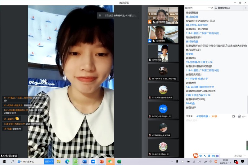 7月12日下午,全体营员与2022届优秀毕业生刘丽霞、2021级研究生陈智婉、陈晓慧进行线上交流。针对营员提出的备考、招生、研究课题及毕业就业等相关问题,辅导员老师和师兄师姐给出了耐心和详细的解答。营员们通过与师兄师姐的交流,解除了疑惑,获得了满意的答案。