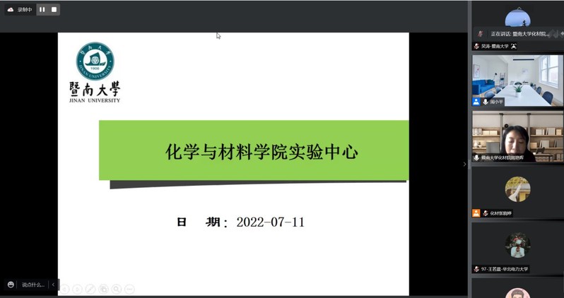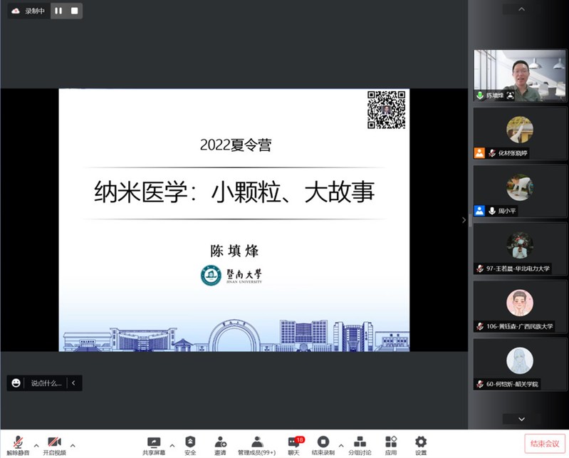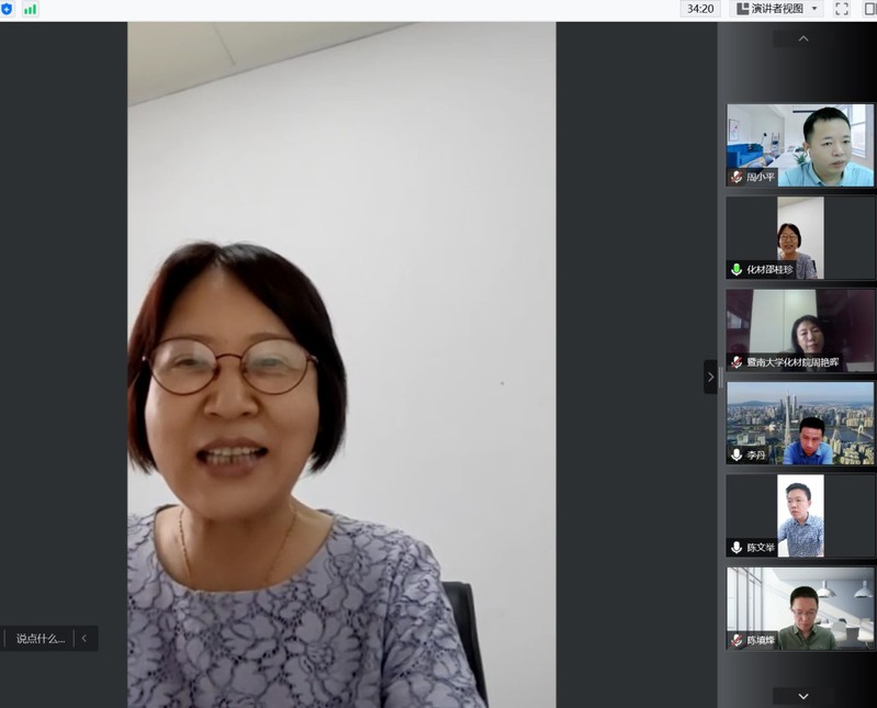 接下来,周小平副院长主持学术前沿讲座环节,李红教授、陈填烽教授及吴涛教授分别就《生物矿化与仿生修复》、《纳米医学:小颗粒,大故事》以及《人造“原子”之金属硫族纳米团簇》为题,给营员们带来了三场精彩生动的学术讲座。学院实验中心常务副主任周艳晖给营员们详细的介绍了实验管理中心,并且带领实验中心的老师们以拍摄视频的方式为营员们介绍了多个大型仪器的操作原理和注意事项,带领营员们线上参观了石牌校区超分子配位化学研究所和番禺校区学院的科研平台。
