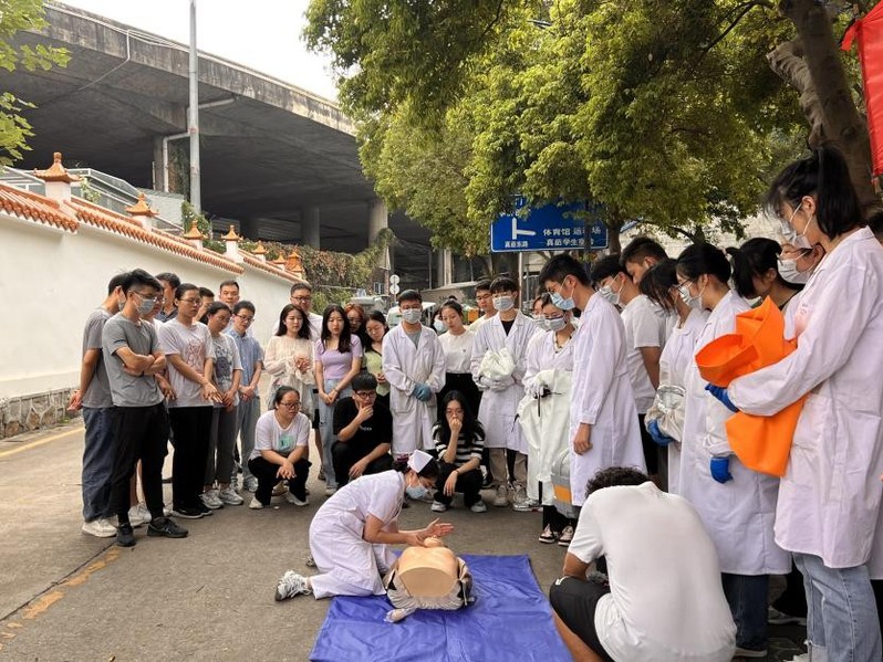 所有人员疏散到安全区域之后,护理学院王欢和程洪涛两位志愿者为现场师生讲解心肺复苏等急救知识、保卫办消防技术人员演示了如何正确使用逃生面罩及灭火器,到场师生认真学习。演示后,在培训人员的指导下,师生们进行了逃生面罩试戴和模拟火灾灭火演习,现场组织严密,学员认真,秩序井然。