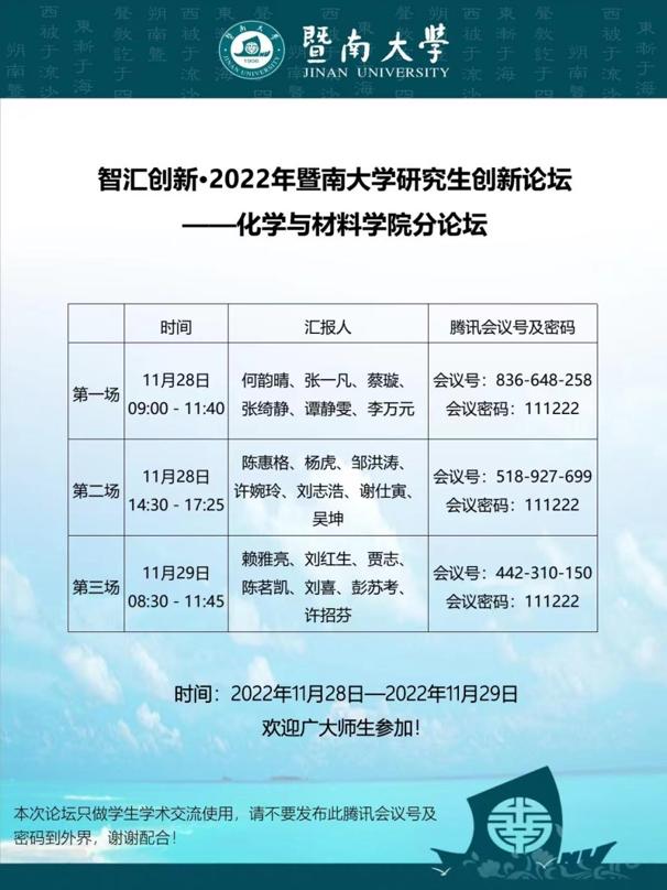 为促进研究生学术研究及创新实践的交流与互动,展示德赢vwin体育官网登录研究生风采和高水平创新成果,提高研究生的学术素养、开拓研究生学术视野、营造浓厚的学术氛围。由德赢vwin体育官网登录研究生院主办,德赢vwin体育官网登录承办的“智汇创新.2022年德赢vwin体育官网登录研究生创新论坛--化学与材料学院分论坛”定于2022年11月28日-29日以腾讯会议形式线上举办。
