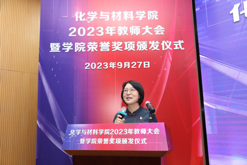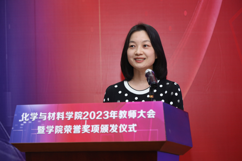 获奖教师代表、材料科学与工程系副教授鲁路分享了在全国高校教师教学创新大赛的备赛、培训和实战演练经验,以及参与其中的收获,并感谢学校教师发展中心、学院、材料系和生物材料课题组团队的支持和帮助。她感谢学院设置荣誉奖项,她说,这些奖项是对老师们工作的肯定,也是极大的鼓舞,会以此为动力,不断前行,努力成为更好的教师,也期待与各位老师共同探索、共同进步,为学生们的发展开拓更美好的未来,为学院的发展贡献力量。