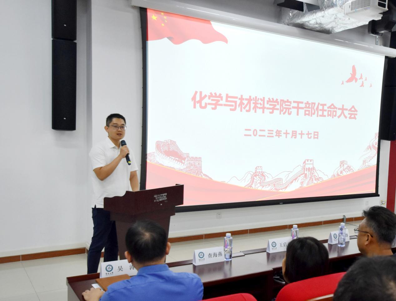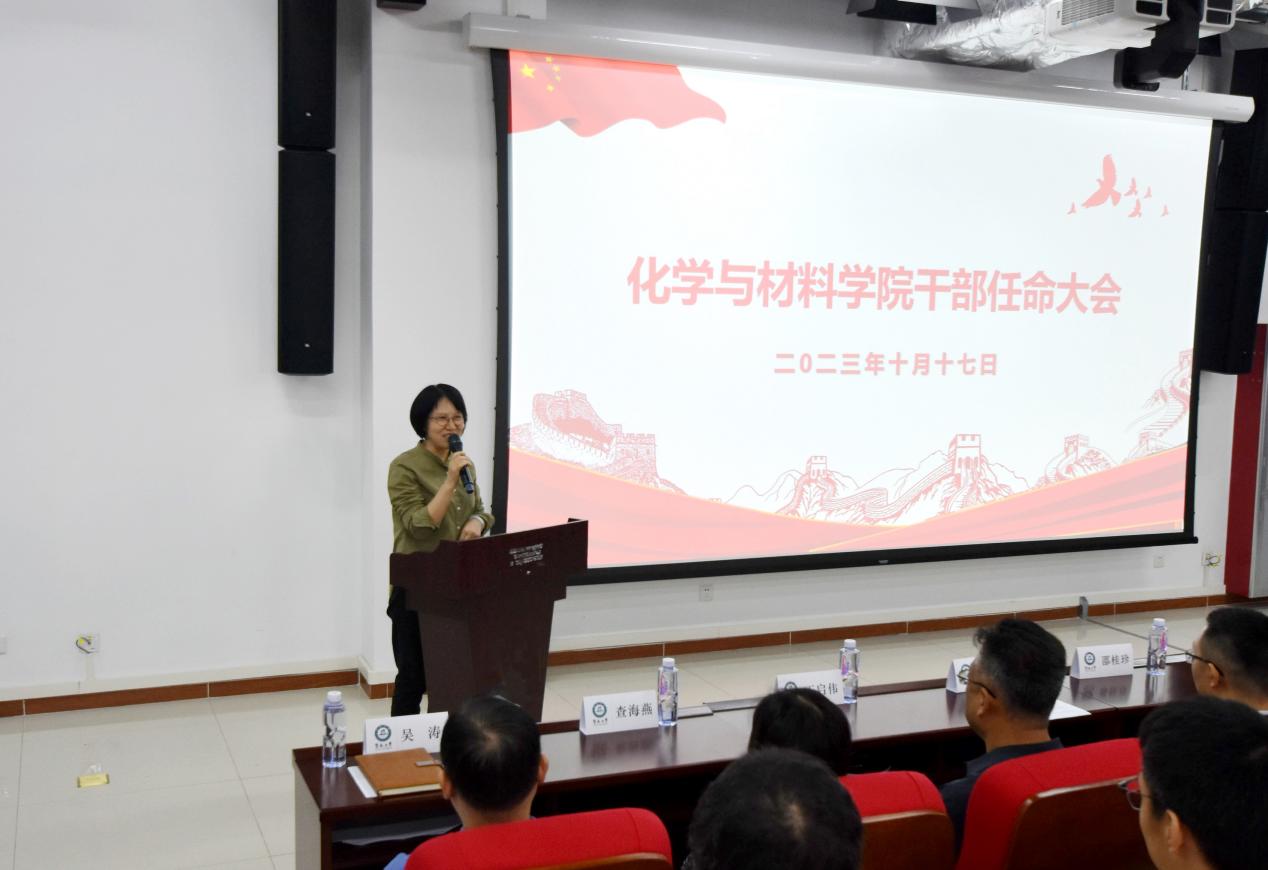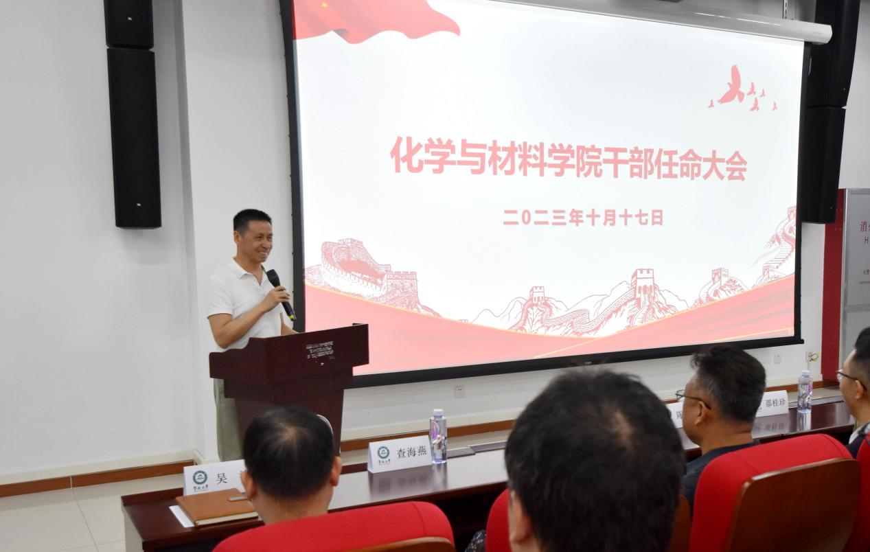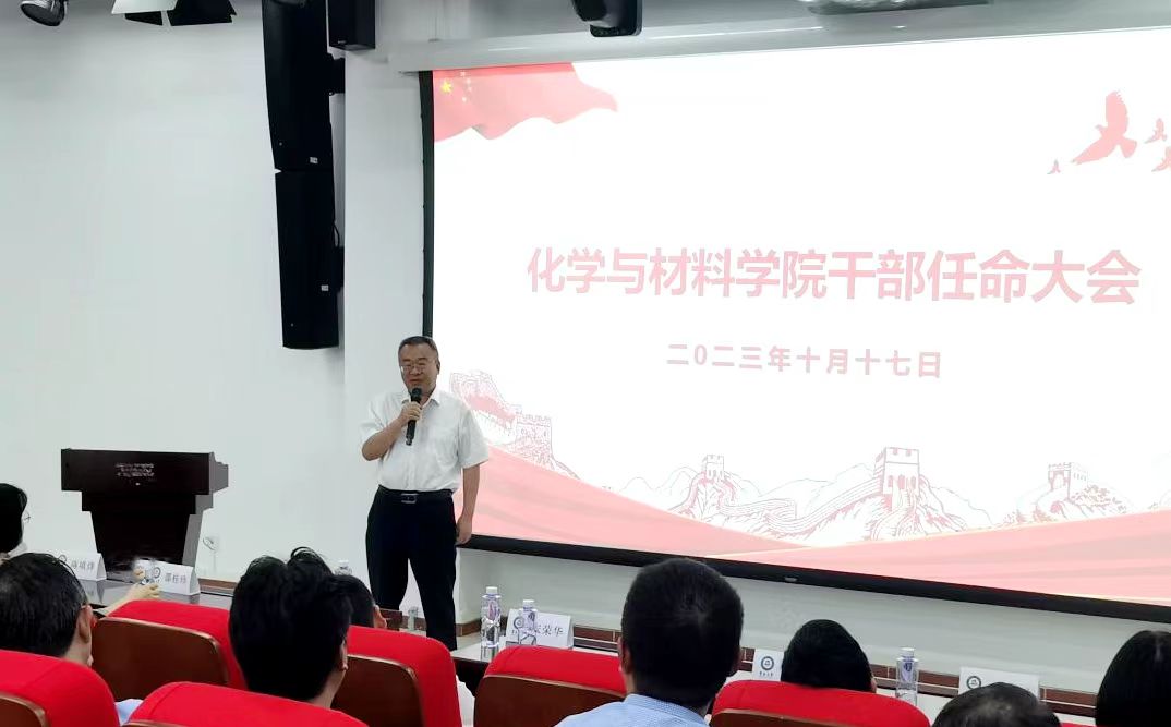 陈龙代表学校党委组织部宣读干部任命文件,经学校党委常委会研究决定,任命陈填烽同志为化学与材料学院院长,吴涛同志为化学与材料学院党委书记;因年龄关系,李丹同志不再担任德赢vwin体育官网登录院长,邵桂珍同志不再担任德赢vwin体育官网登录党委书记。