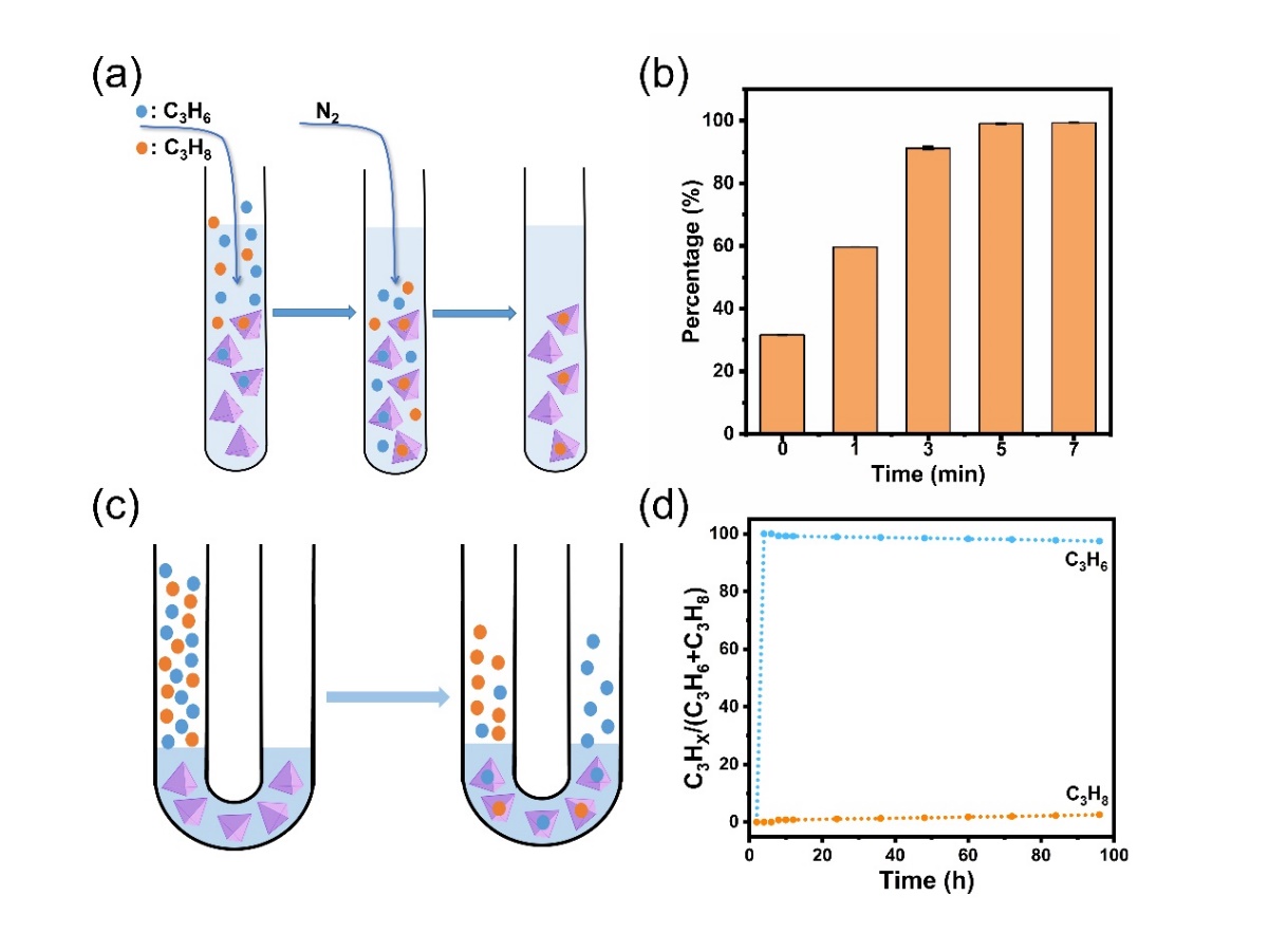 图4.(a)丙烷/丙烯混合气体的吸附与解吸示意图;(b)向C3H6@Fe4L6与C3H8@Fe4L6的混合溶液中鼓泡氮气持续不同时间后溶液中丙烷的比例;(c)在U形管中通过Fe4L6金属有机笼分离丙烷和丙烯的示意图;(d)U形管进气端为97%的丙烯混合气体时,集气端的气体纯度随时间变化的分析。