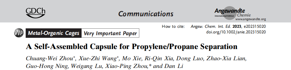 近日,德赢vwin体育官网登录,超分子配位化学研究所周小平/李丹教授团队在Angew. Chem. Int. Ed.上发表了题为A Self-Assembled Capsule for Propylene/Propane Separation的重要研究成果,并被选为VIP论文(图1)。