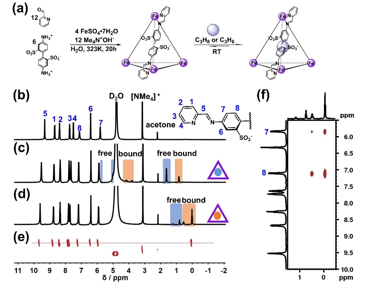 图2.(a)Fe4L6金属有机笼的合成路线以及包封丙烷/丙烯的示意图;(b)Fe4L6,(c)C3H6@Fe4L6和(d)C3H8@Fe4L6的1H NMR谱图;(e)C3H8@Fe4L6的1H DOSY NMR谱图;(f)C3H8@Fe4L6的1H–1H NOESY NMR谱图(D2O, 400 MHz, 298 K)。