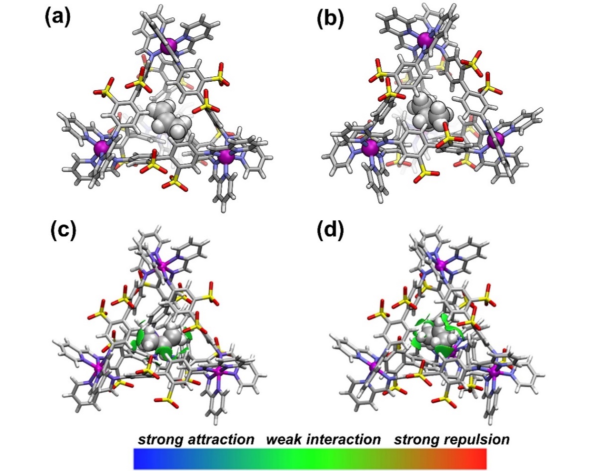 图3.(a)C3H6@Fe4L6和(b)C3H8@Fe4L6的单晶结构;(c)C3H6@Fe4L6和(d)C3H8@Fe4L6的非共价作用分析。颜色尺度显示了一个相互作用强度的范围,从强吸引力(蓝色)到接近范德华半径的弱相互作用(绿色),再到强排斥力(红色)。