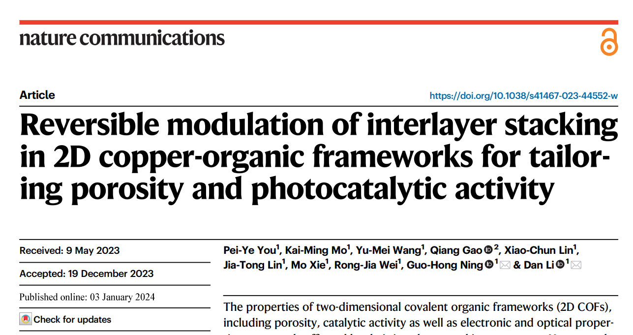 近日,德赢vwin体育官网登录宁国宏/李丹教授团队以德赢vwin体育官网登录为唯一通讯单位于2024年01月03日,在Nature Communications(IF=16.6)上发表了题为 “Reversible modulation of interlayer stacking in 2D copper-organic frameworks for tailoring porosity and photocatalytic activity” 的重要研究成果(图1)。