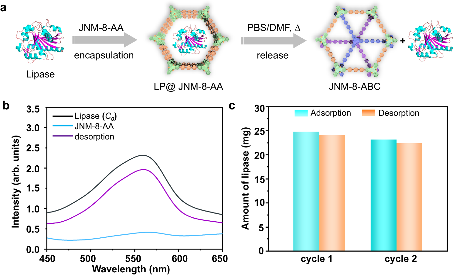 图3(a) 脂肪酶被封装和释放的示意图;(b) 脂肪酶溶液的紫外可见吸收光谱;(c) JNM-8-AA对脂肪酶吸附和脱附量。