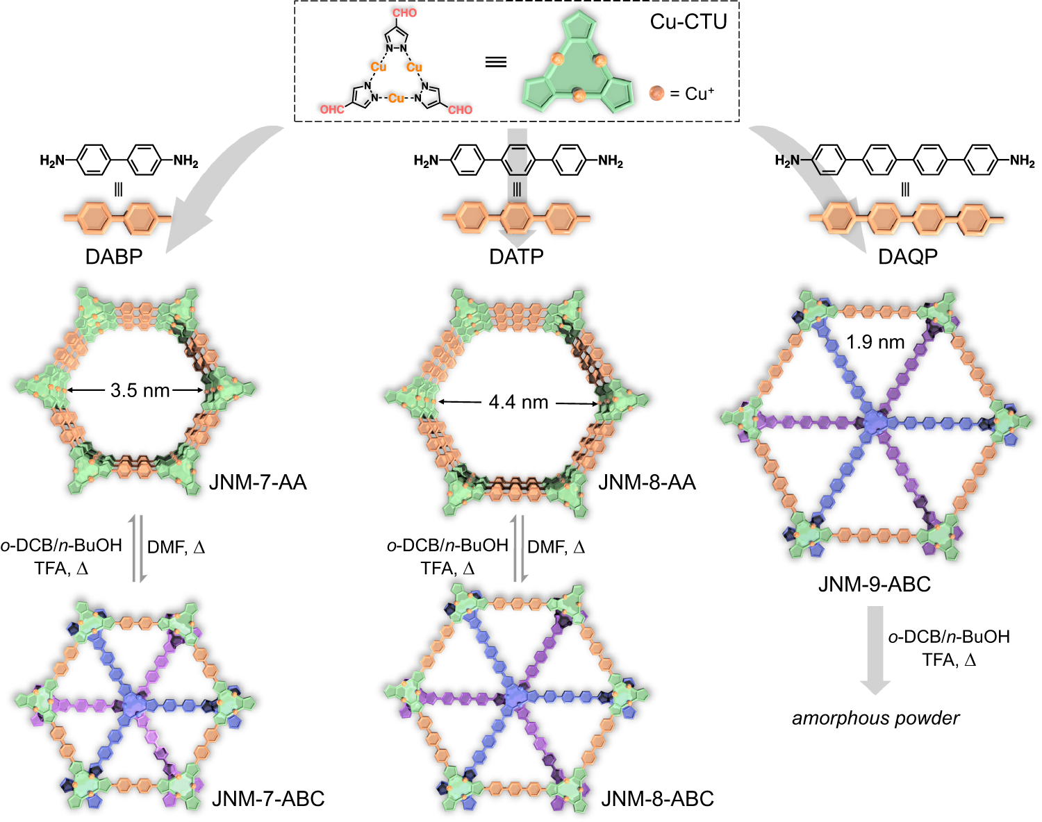 宁国宏/李丹教授团队一直致力于环三核团簇基共价金属有机框架(CMOF)材料的研究,在之前工作(CCS Chem. 2020, 2, 2045–2053;Chem. Sci. 2021, 12, 6280–6286;J. Am. Chem. Soc., 2022, 144, 17487–17495;Angew. Chem. Int. Ed.2023, 62, e202306497)的基础上,我们选用环三核铜Cu-CTU分别与不同长度的氨基有机连接子,通过亚胺缩合反应制备了三种二维铜有机骨架(CuOF),命名为JNM-n(n =7、8和9)。有趣的是,通过溶剂、酸和热的刺激,可以实现AA层堆积(即JNM-7-AA和JNM-8-AA)和ABC层堆积(即JNM-7-ABC和JNM-8-ABC)结构之间的可逆转化(图2)。重要的是,在去除溶剂和酸后,材料的层间堆积结构仍然能保持稳定。