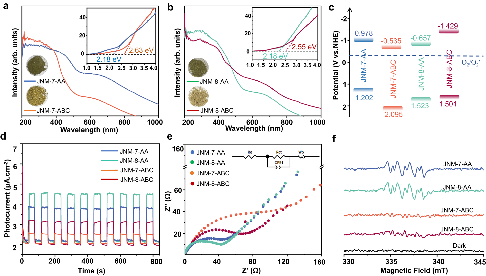 图4(a) JNM-7-AA和JNM-7-ABC (b) JNM-8-AA 和 JNM-8-ABC的固体紫外可见漫反射光谱;(c) JNMs材料的能级图;(d) JNMs材料的光电流曲线;(e) JNM材料的抗阻图;(f) JNMs的电子顺磁共振光谱光谱图。