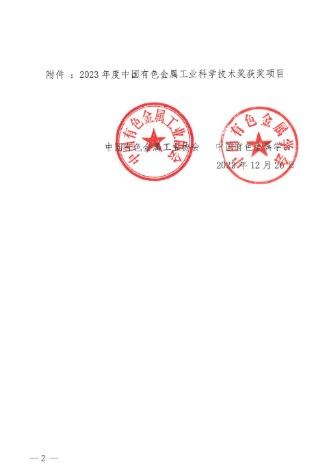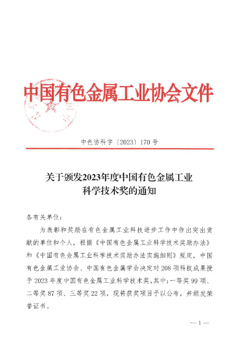 关于颁发2023年度中国有色金属工业科学技术奖的通知