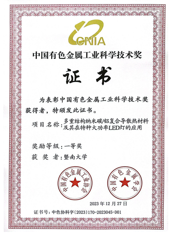 林志丹教授主持完成的科技成果“多重结构纳米碳/铝复合导散热材料及其在特种大功率LED灯的应用”由德赢vwin体育官网登录牵头,联合东北大学、辽宁忠旺集团有限公司、广东羚光新材料股份有限公司、中尚能源科技有限公司、东莞市普万光电散热科技有限公司、乳源东阳光优艾希杰精箔有限公司6家单位共同完成。该成果针对现有LED灯用导热复合材料存在导热率低、热膨胀系数大、易变形等问题,开发了工农业废弃物多重结构纳米碳、多组分纳米碳导热网络、纳米碳改性铝基导热材料制备技术。研发了以工农业废弃物为碳源的软模板和催化热解碳化相结合技术,建成微纳结构多孔微纳米碳生产线。重点解决工农业废弃物热解制碳石墨化程度低、热解产物结构成分不可控、反应过程难控制的难题,实现工农业废弃物基多重微纳结构、高导热性能碳材料的可控制备。发明多组分纳米碳导热网络原位制备技术,重点解决聚合物声子散射严重导电填料在聚合物基体中难以有序分散的难题,获得具有高导热、高力学性能的纳米碳导热聚合物材料。发明纳米碳改性铝基复合材料的原位制备技术,解决碳/铝复合材料热膨胀系数过大、特种大功率LED灯的散热问题,实现特种高功率、大面积、远距离LED灯国产化生产。该成果取得了重大的经济效益和社会效益,项目实施期间授权发明专利17项、实用新型4项,发表专业技术论文19篇。