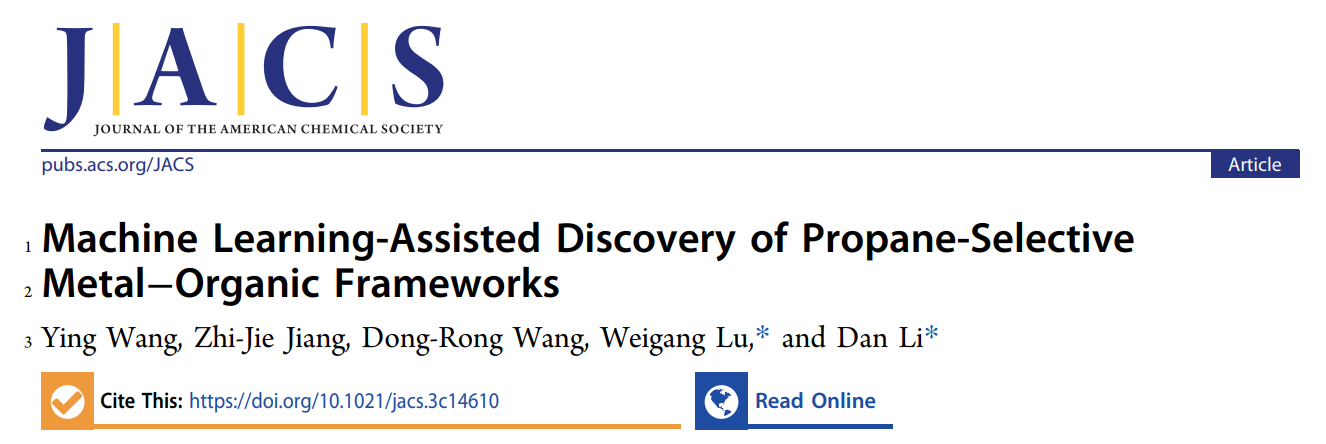 近日,德赢官网超分子配位化学研究所陆伟刚/李丹教授团队在J. Am. Chem. Soc.上发表了题为“Machine Learning-Assisted Discovery of Propane-Selective Metal−Organic Frameworks” 的重要研究成果。
