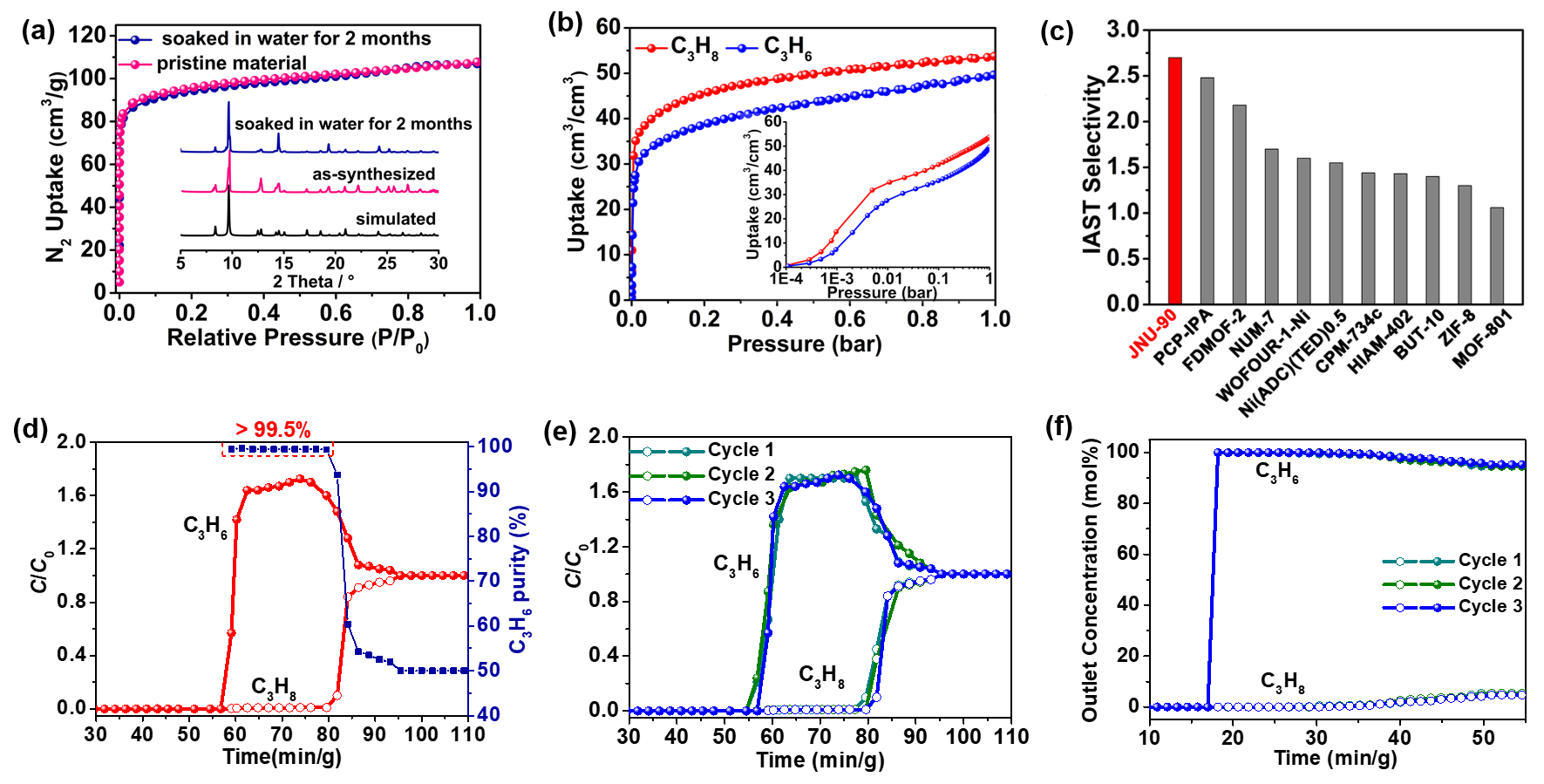 图3. (a) JNU-90 在77 K 下对N2的吸附等温线。(b) JNU-90 在 298 K 下的单组分C3H8 和C3H6吸附等温线。 (c) C3H8选择性MOF的IAST选择性之间的比较。(d) JNU-90对C3H8/C3H6 (50/50)混合物的穿透实验。(e, f) JNU-90对C3H8/C3H6 (50/50)和C3H8/C3H6 (5/95) 混合物的穿透循环实验。