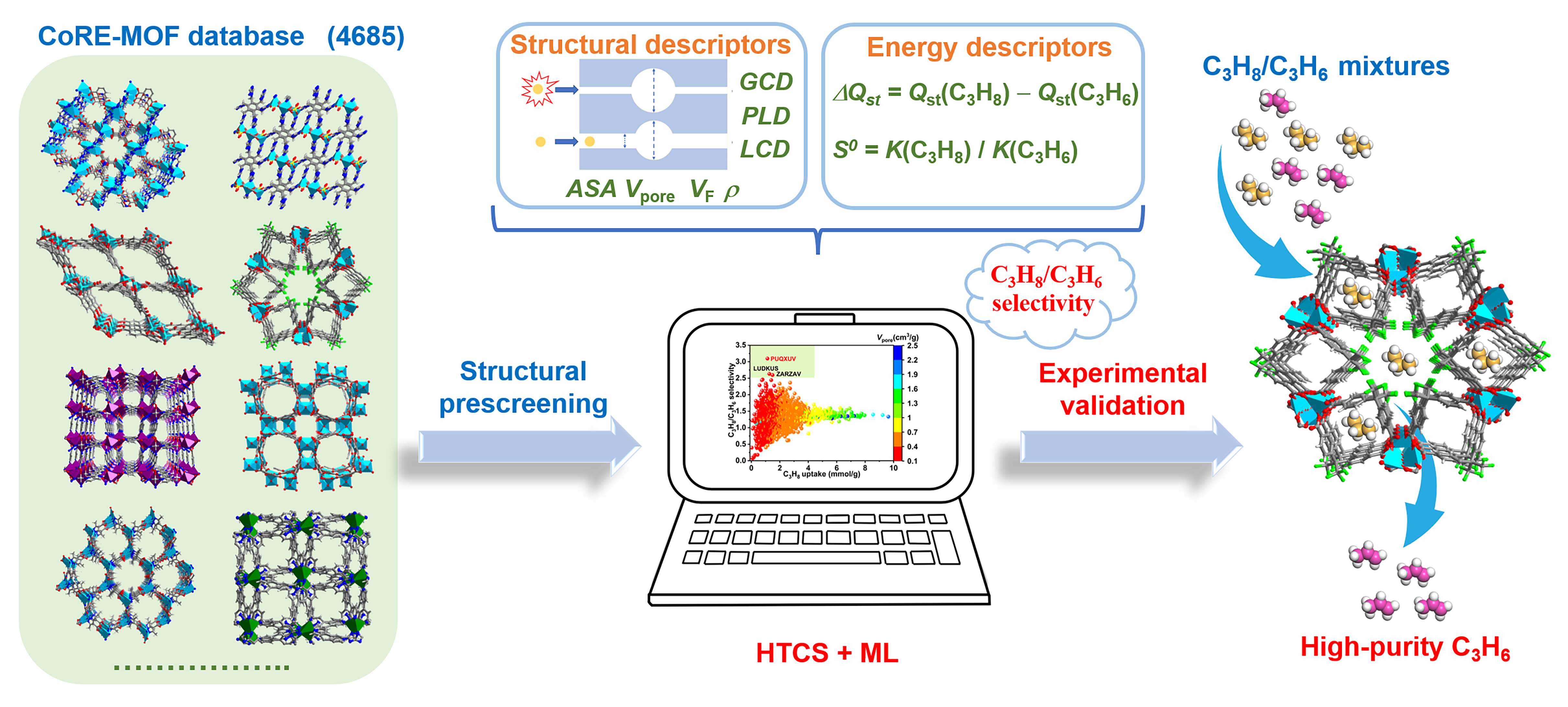 利用MOF设计思想,设计合成具有特定功能的材料仍具有极大的挑战,需要经过大量的试错实验。当前,已报道的MOF种类和数量繁多,如能对现有MOF进行特定功能的计算筛选,开发MOF的新功能应用,可能是一条重要的途径。基于此,研究团队报道了一种机器学习辅助筛选策略,用于发现丙烷选择性吸附MOF,并对筛选出性能最佳的 MOF(JNU-90)进行实验验证。