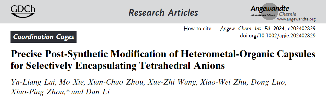近日,德赢vwin体育官网登录,超分子配位化学研究所周小平/李丹教授团队开发了一种通过后合成修饰精准合成MOC的新策略。该工作以“Precise Post-Synthetic Modification of Heterometal-Organic Capsules for Selectively Encapsulating Tetrahedral Anions”为题发表在Angewandte Chemie International Edition(德国应用化学,IF=16.6)上。