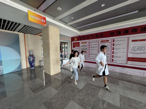 活动根据演练预案进行。根据预案,模拟起火点设置在学院楼5027实验室。发现起火后,该实验室学生立即向校区报告火情,随即火警触发。楼内工作的师生迅速有序地沿逃生通道撤离,由10名老师组成的疏散组分别确认各楼层房间内师生疏散完毕。