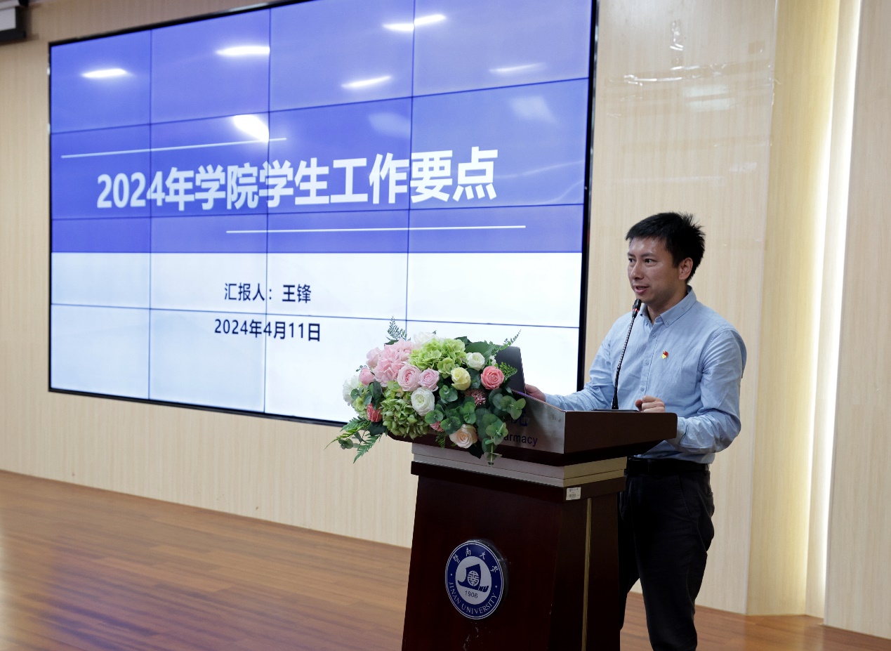 王锋从学生思想政治教育、就业升学指导等方面进行了总结。并提出今后的工作要点,以党建带团建,推进思政工作迈向精细化;多举措地培育优良学风,提升深造和就业率;结合学科的特点,开展品牌文体活动;一人一策,有序地推进各类专项以及日常工作。并表示未来将持续关注学生思政教育和心理健康教育,引导学生扣好人生的第一粒扣子。