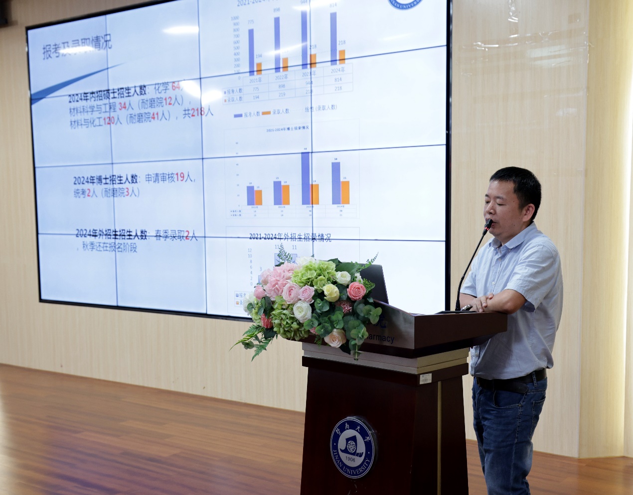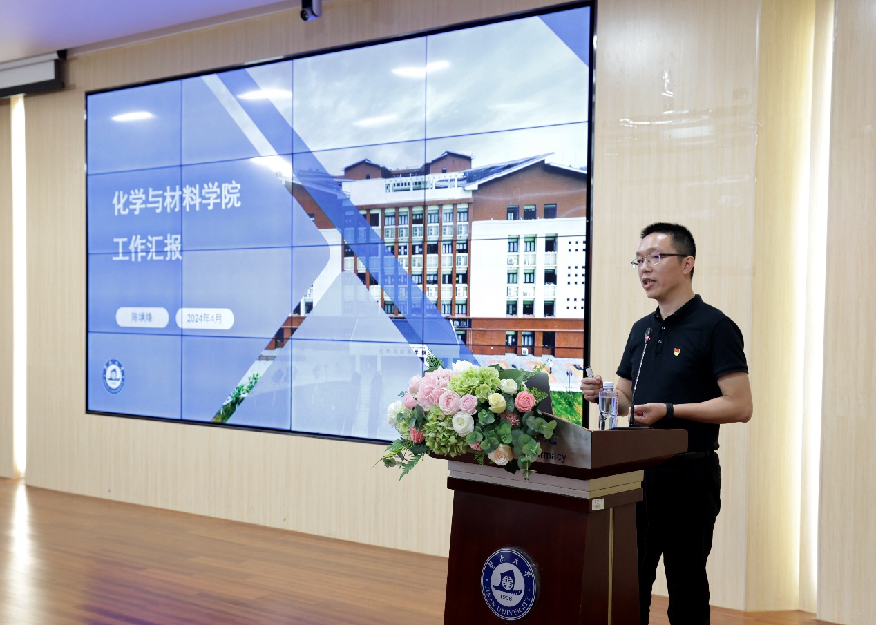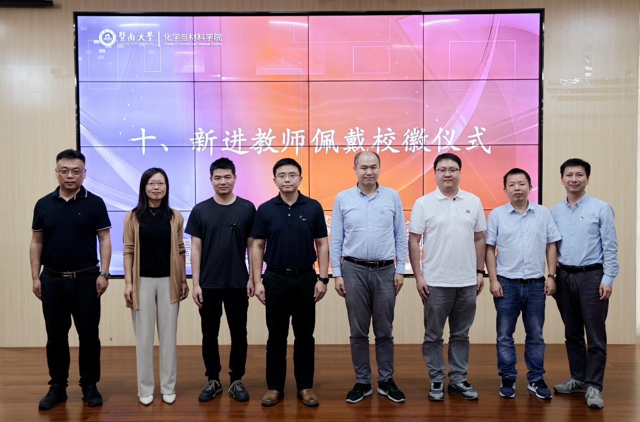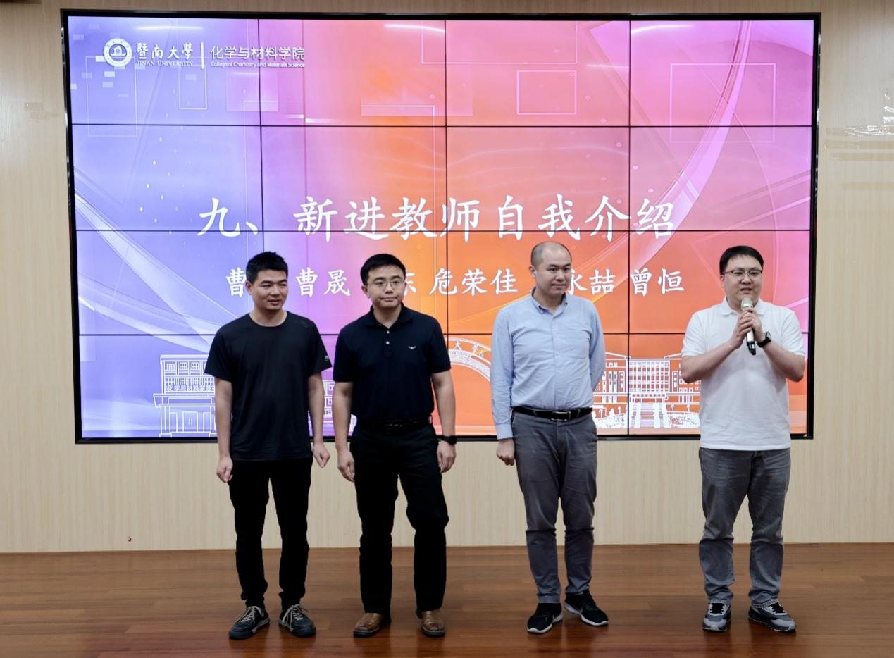 新进教师罗东、危荣佳、曹晟、曾恒分别进行了自我介绍,纷纷表示很荣幸加入化材大家庭,将努力工作,为学院的发展贡献力量。学院领导为新进教师佩戴校徽,象征着新教师正式成为学院的一员,同时寄予了对他们未来工作的期望和鼓励。