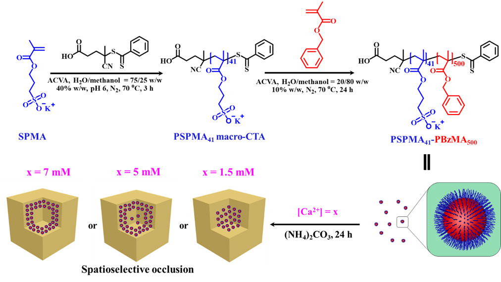 图2.聚(甲基丙烯酸3-磺酸丙酯钾盐)41-b-聚(甲基丙烯酸苄酯)500 [PSPMA41-PBzMA500]的合成及其在方解石晶体中的空间选择性内嵌。