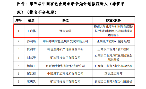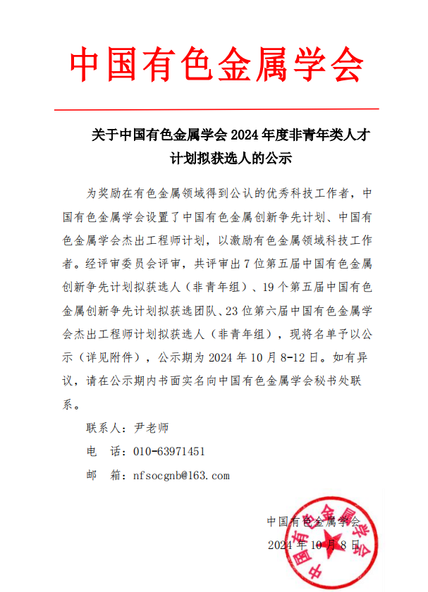 2024年10月,中国有色金属学会发布了《关于中国有色金属学会2024年度非青年类人才计划拟获选人的公示》,为奖励在有色金属领域得到公认的优秀科技工作者,中国有色金属学会设置了中国有色金属创新争先计划、中国有色金属学会杰出工程师计划,以激励有色金属领域科技工作者。经评审委员会评审,德赢vwin体育官网登录王启伟研究员获批中国有色金属学会2024年度创新争先人才计划。