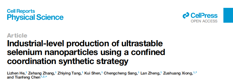 Industrial-level production of ultrastable selenium nanoparticles using a confined coordination synthetic strategy, Lizhen He, Zehang Zhang, Zhiying Tang, Kui Shen, Chengcheng Sang, Lan Zheng, Zushuang Xiong*, and Tianfeng Chen*, Cell Reports Physical Science, 2024, 5, 102303.