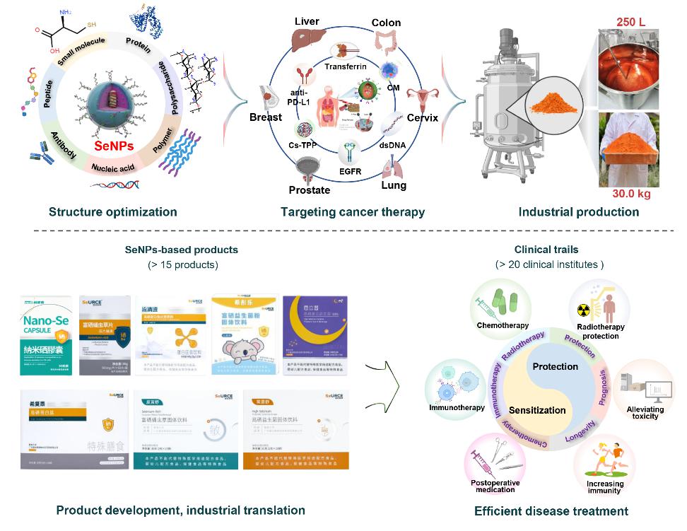 在这一工作中,作者总结了团队近年来在硒纳米药物开发、产业转化与临床应用的进展。(1)、构建了一种高效低毒的新型硒形态:零价态纳米硒,解析了纳米硒微观结构为硒环和硒链组成的硒原子簇,探究了纳米硒结构决定其生物学效应的内在机制(Chen* et al. Angew Chem Int Edit, 2024,e202416006)。利用香菇多糖限域配位策略稳定纳米硒结构,突破了纳米硒工业化生产关键技术(Chen* et al. Cell Rep. Phys. Sci., 2024, 5, 102303)。(2)、以纳米硒为核心原料,开发了4条生产线、超过15种纳米硒产品,并将其应用于生物医药、食品保健、营养康复等多个领域,满足了不同人群和不同临床适应症对Se营养补充治疗的不同需求。(3)、与20多家临床机构开展了SeNPs增效减毒的多中心临床转化研究,并在肿瘤(Chen* et al. Advanced Materials, 2025, 2415818)、脓毒症、骨相关疾病、消化系统疾病和神经系统疾病的临床辅助治疗中取得一定的临床疗效。